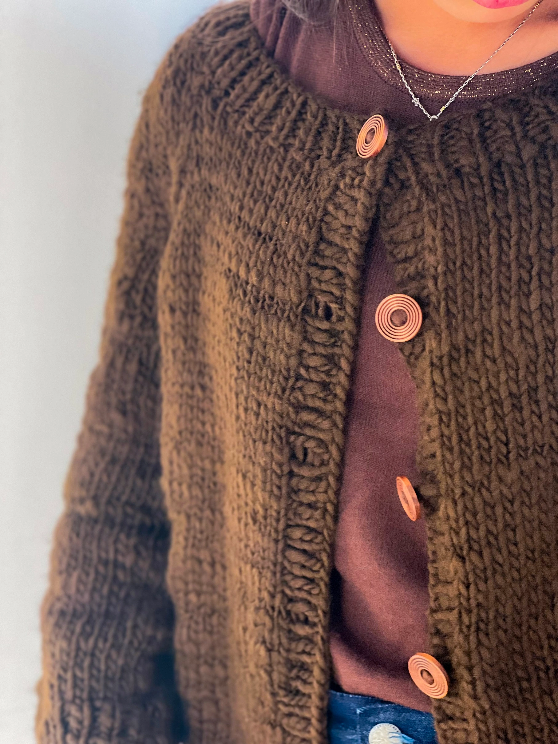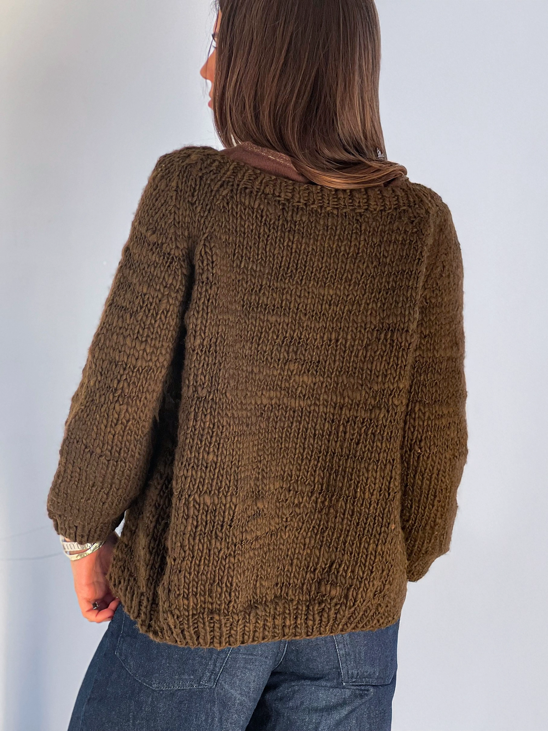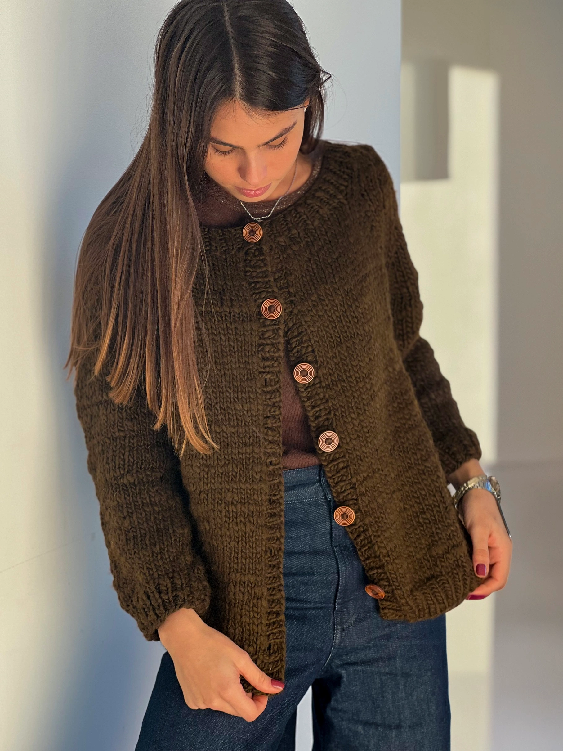 Clásico, cálido y con carácter. El Cardigan Mocca está tejido en lana gruesa y suave, en un tono marrón intenso que recuerda al café fuerte y a los días fríos en el campo.
