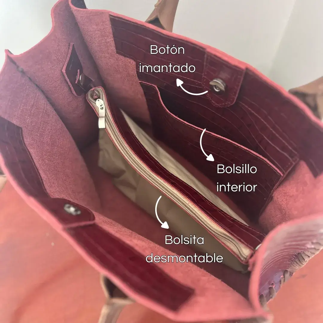 Incluye un bolsillo interior, cierre con botón imantado y una bolsa neceser desmontable con cierre. Su tamaño estándar es perfecto para llevar todo lo que necesitás.
