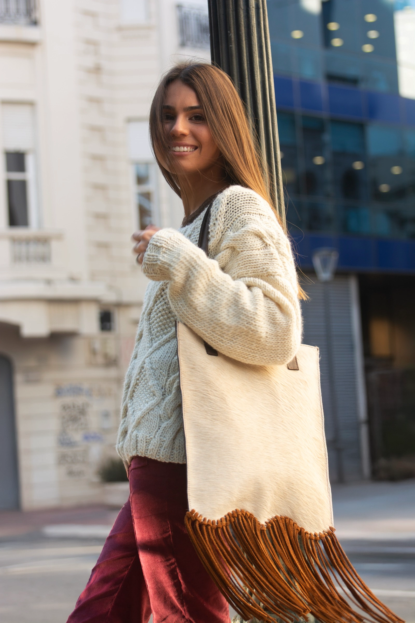La Criolla Bag llega con un diseño que honra nuestras raíces: confeccionada en cuero de pelo natural combinado con cuero liso en tono chocolate, es una pieza que habla del campo con elegancia.