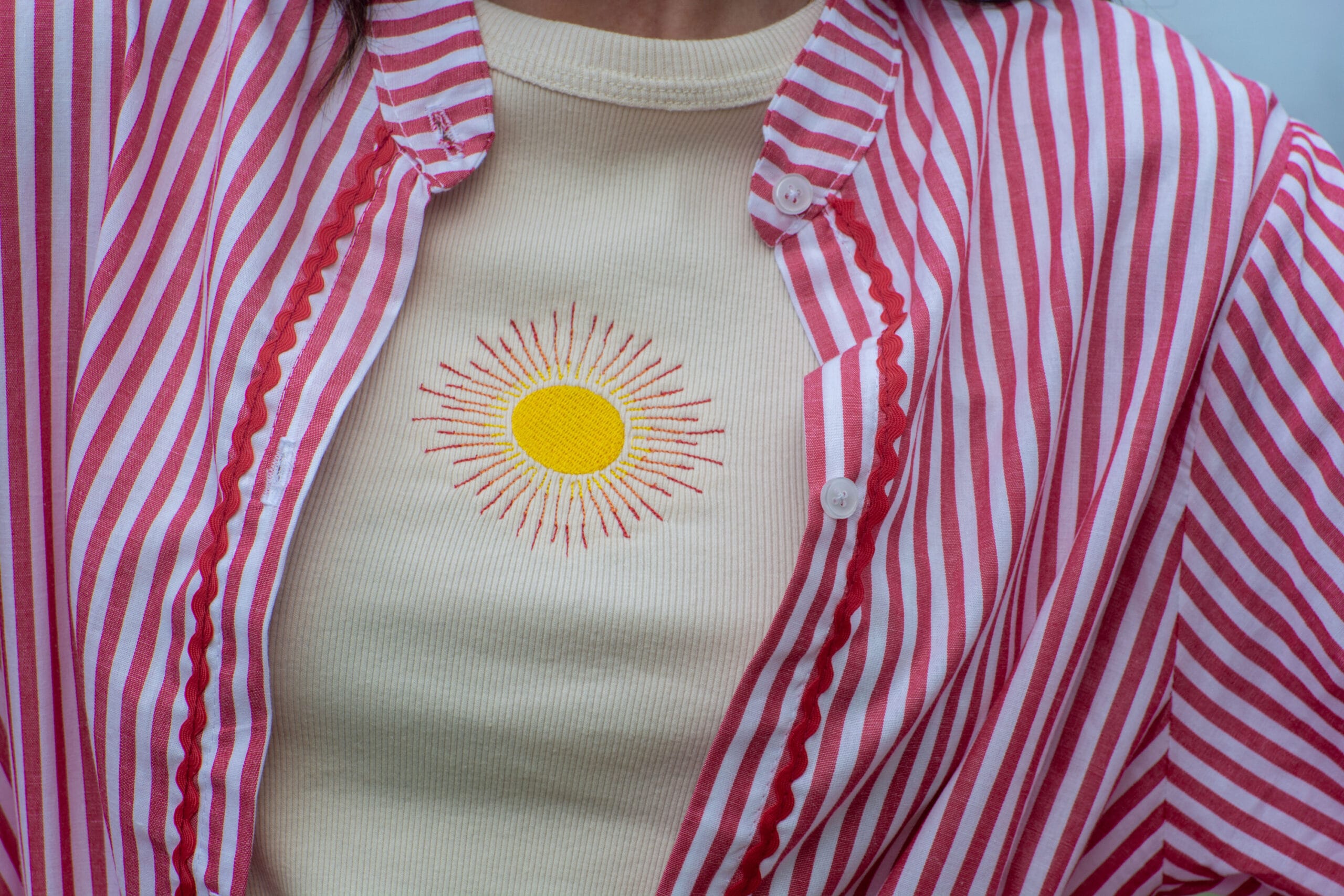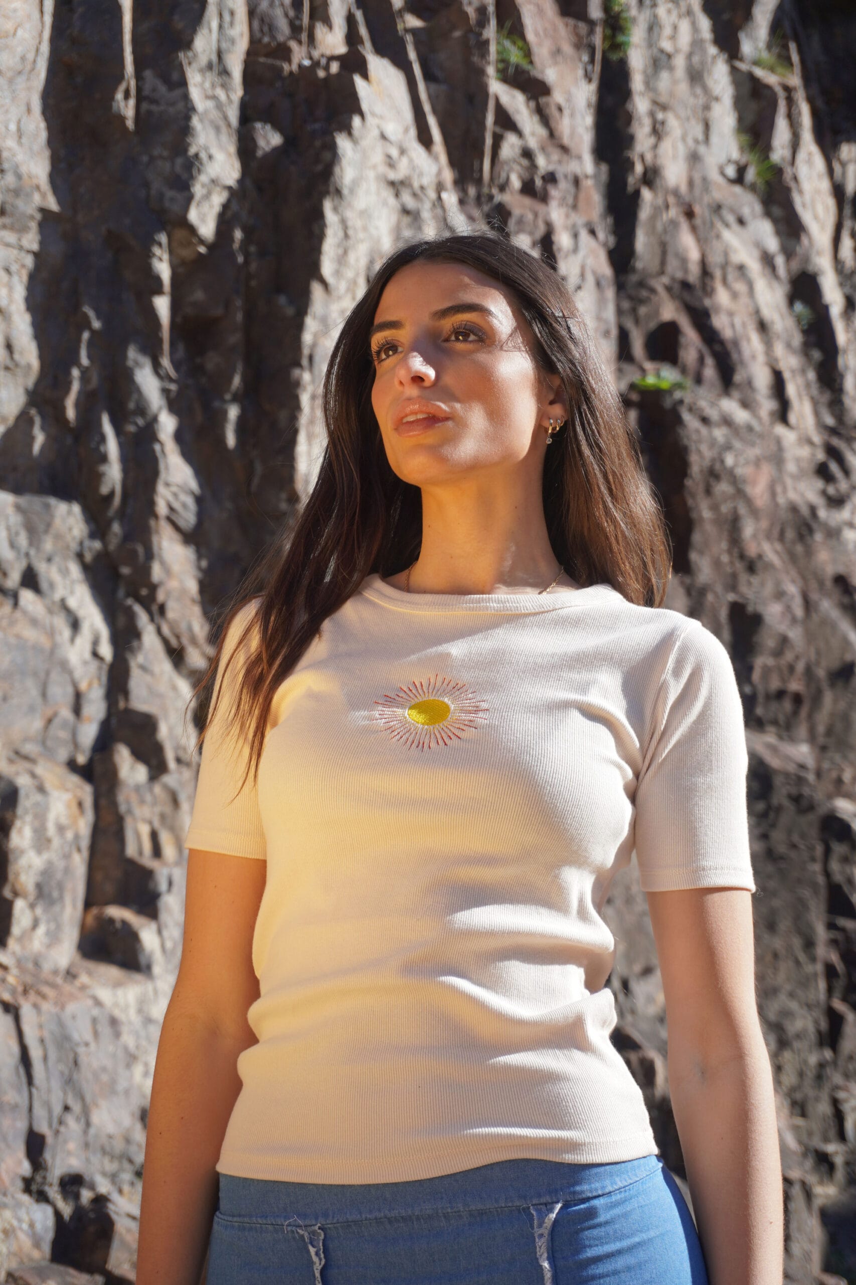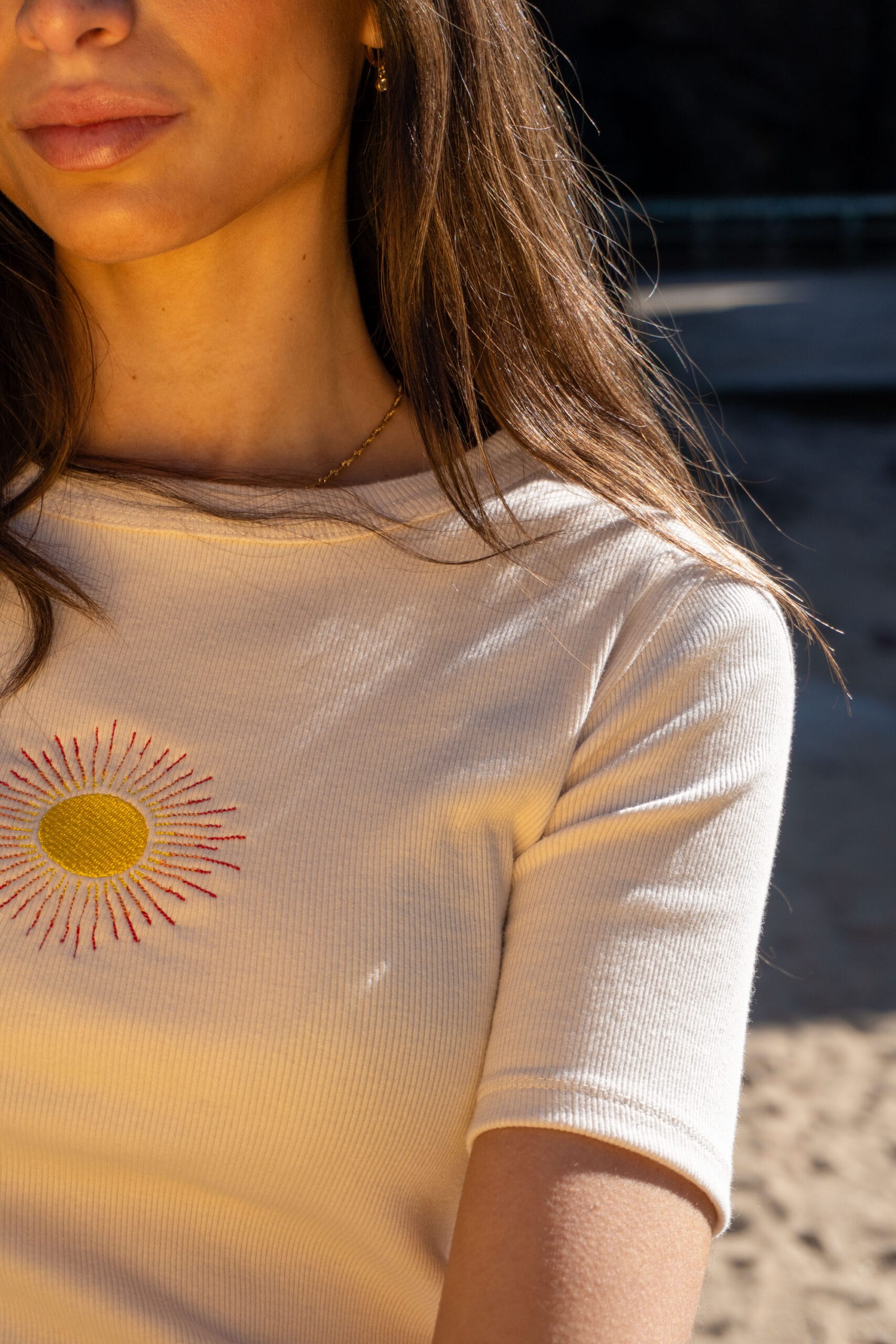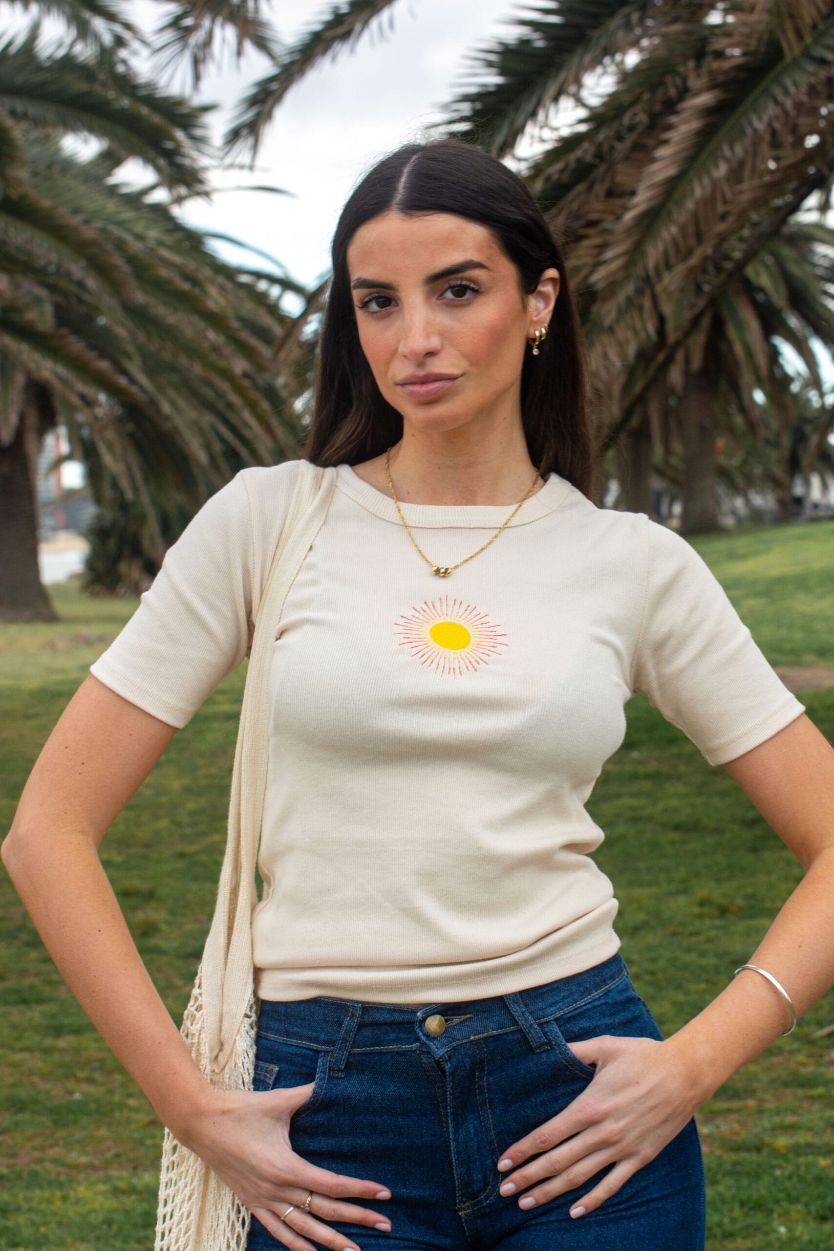 La Remera Soleil es ese básico imprescindible que acompaña todos los veranos. Confeccionada en 100% algodón, en un suave tono arena, combina comodidad y frescura con un detalle único: el bordado del sol de la colección en el frente, un guiño al espíritu de Rancheando sous le soleil.